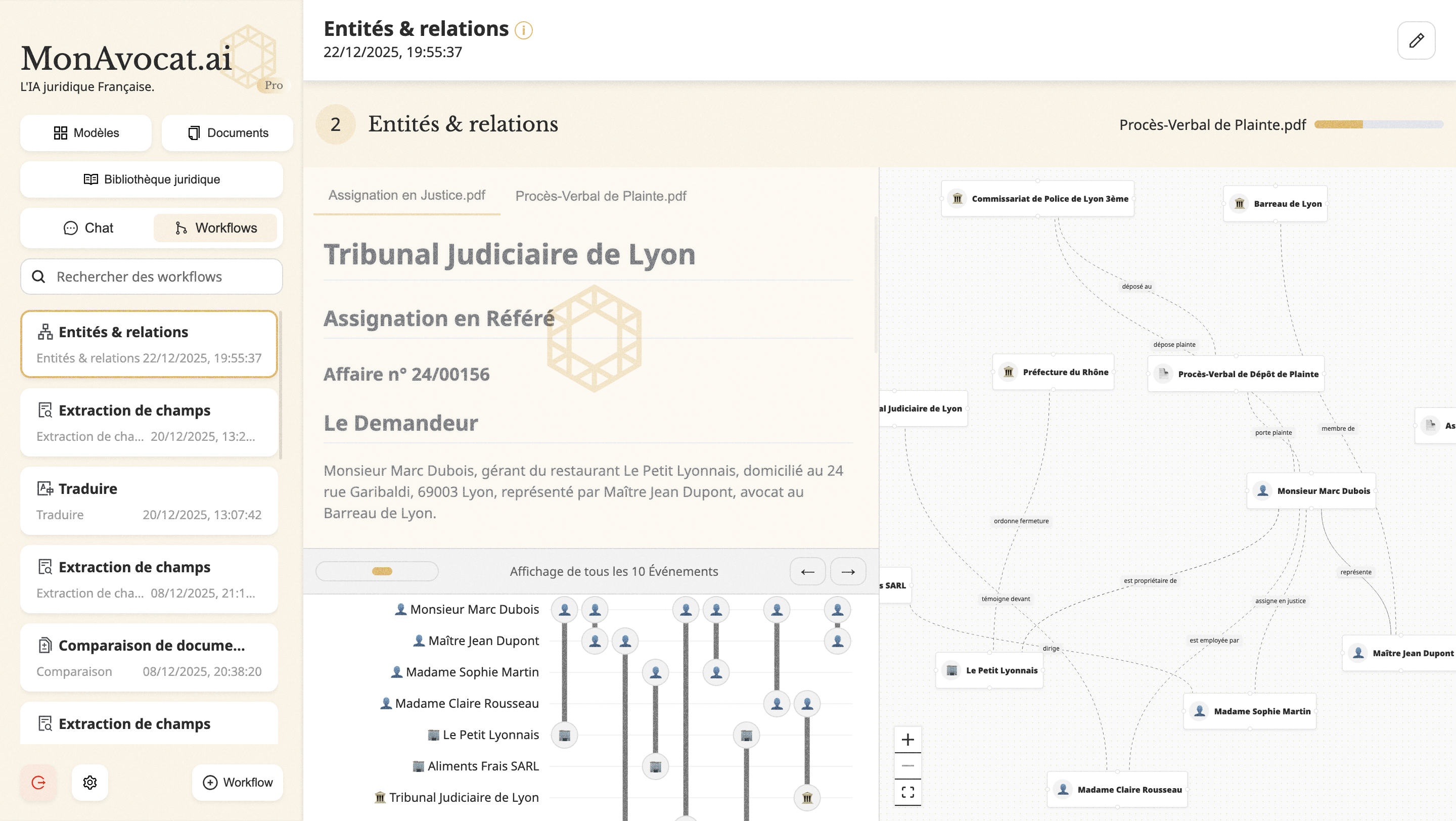 - Identifier toutes les entités : personnes, entreprises, dates, lieux, montants, références juridiques