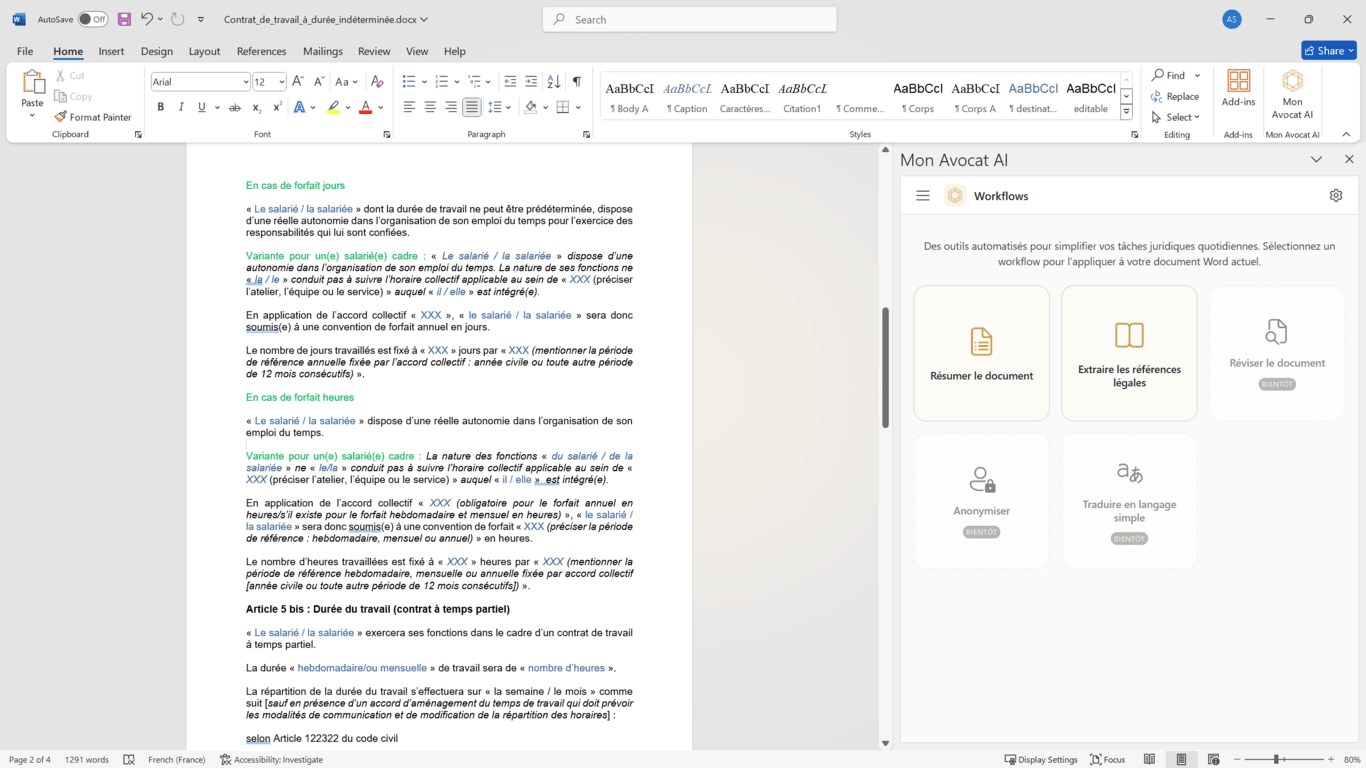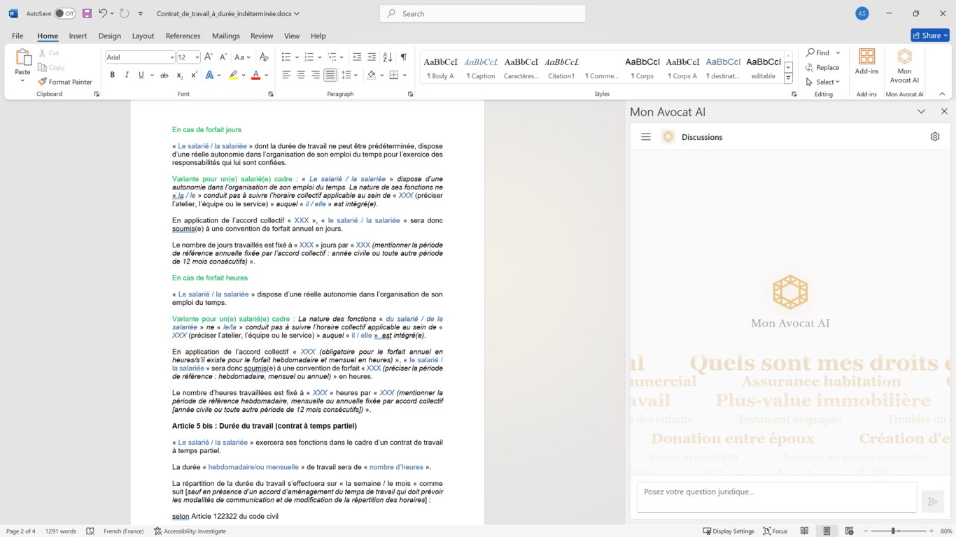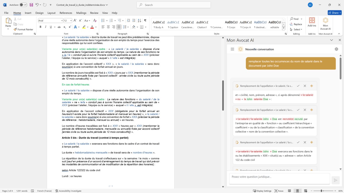 L'agent comprend le contexte de votre document et peut vous aider à l'améliorer en temps réel, transformant Word en un véritable environnement de rédaction juridique assistée par IA.